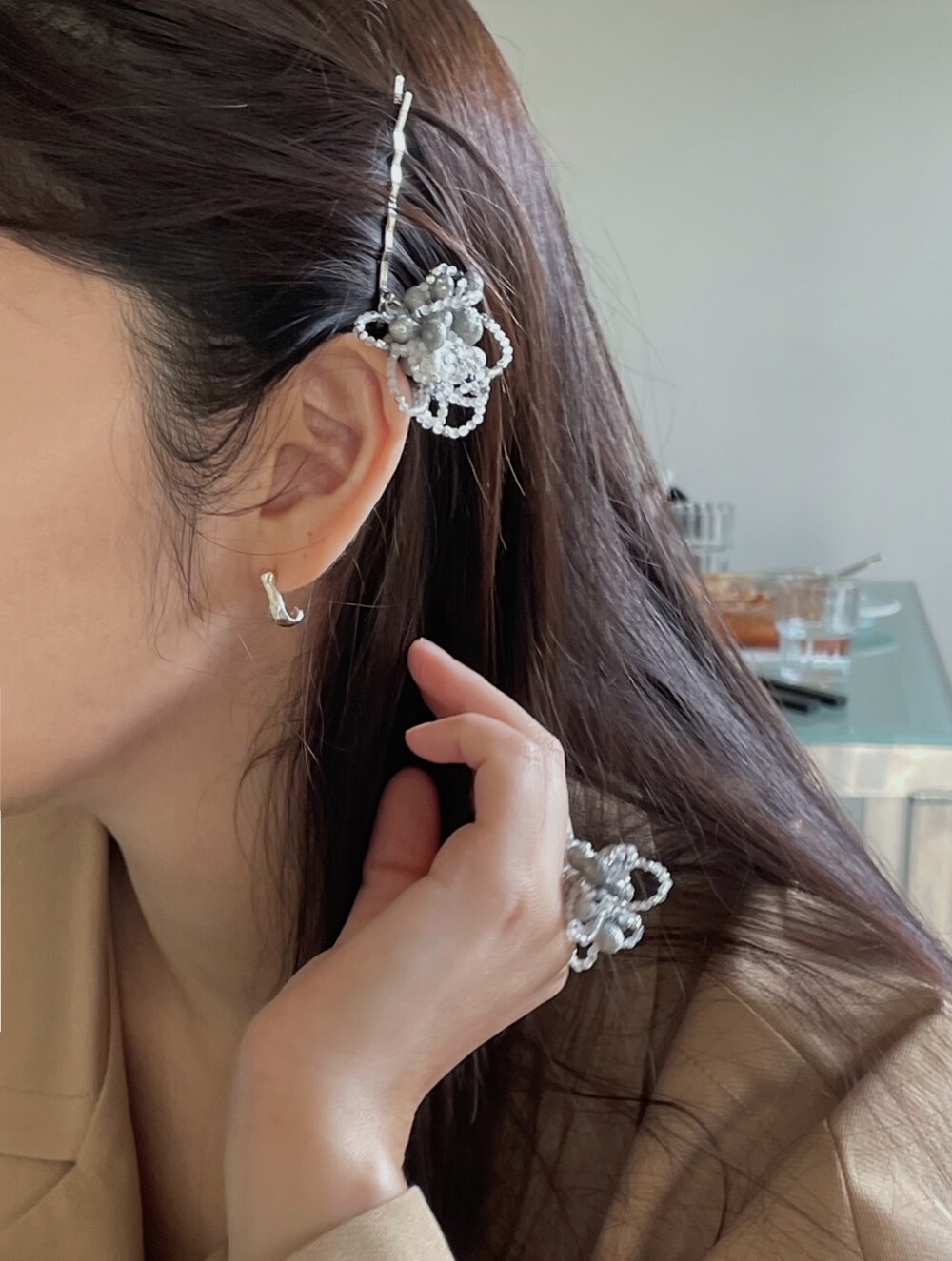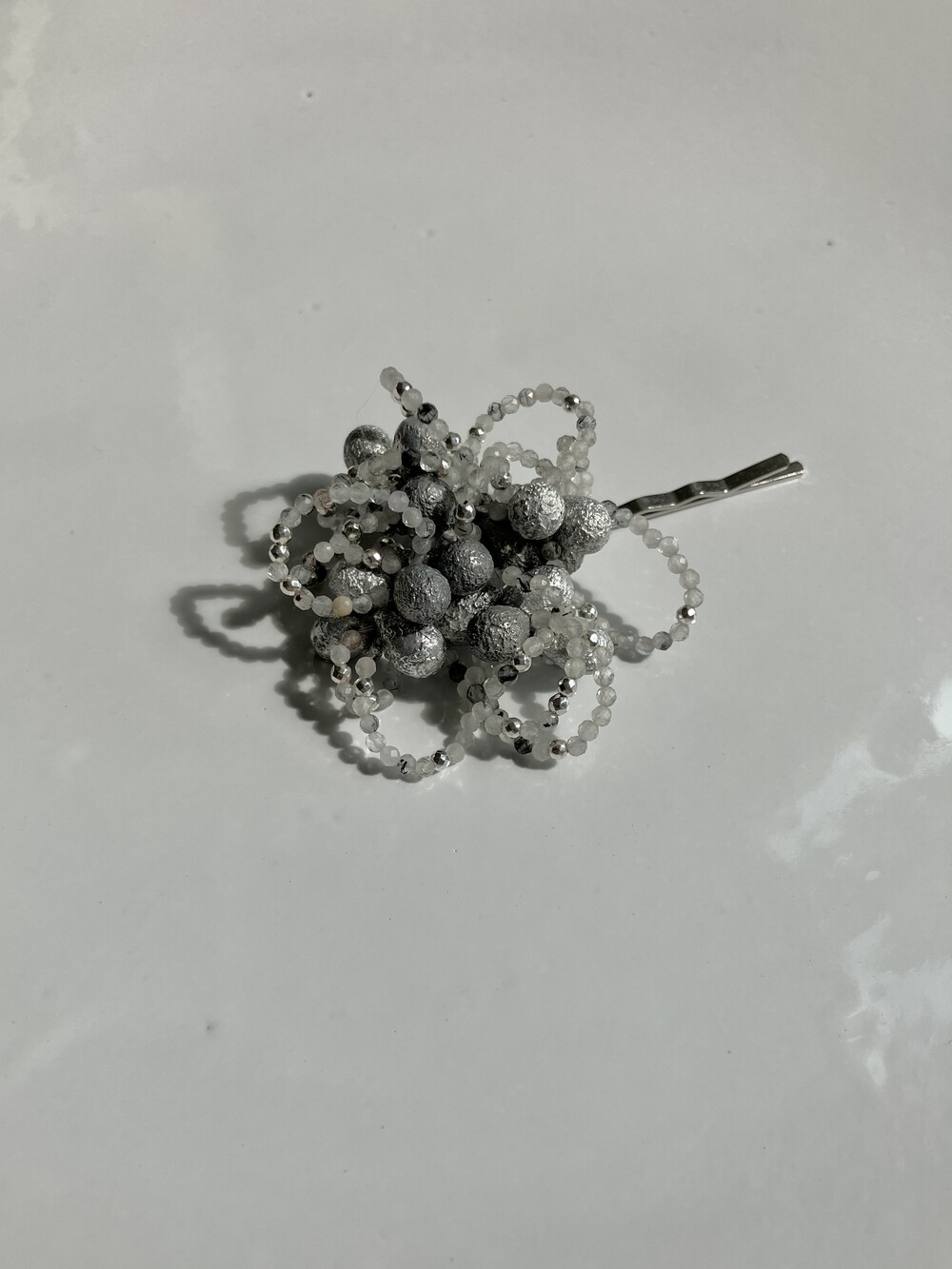 - 내츄럴 스톤과 실버 빛 비즈를 조합하여 마치 플라워 모양을 이룬 아름다운 팬던트 - 뛰어난 내구성으로 변색, 스키래치에강한 로듐 소재의 헤어핀