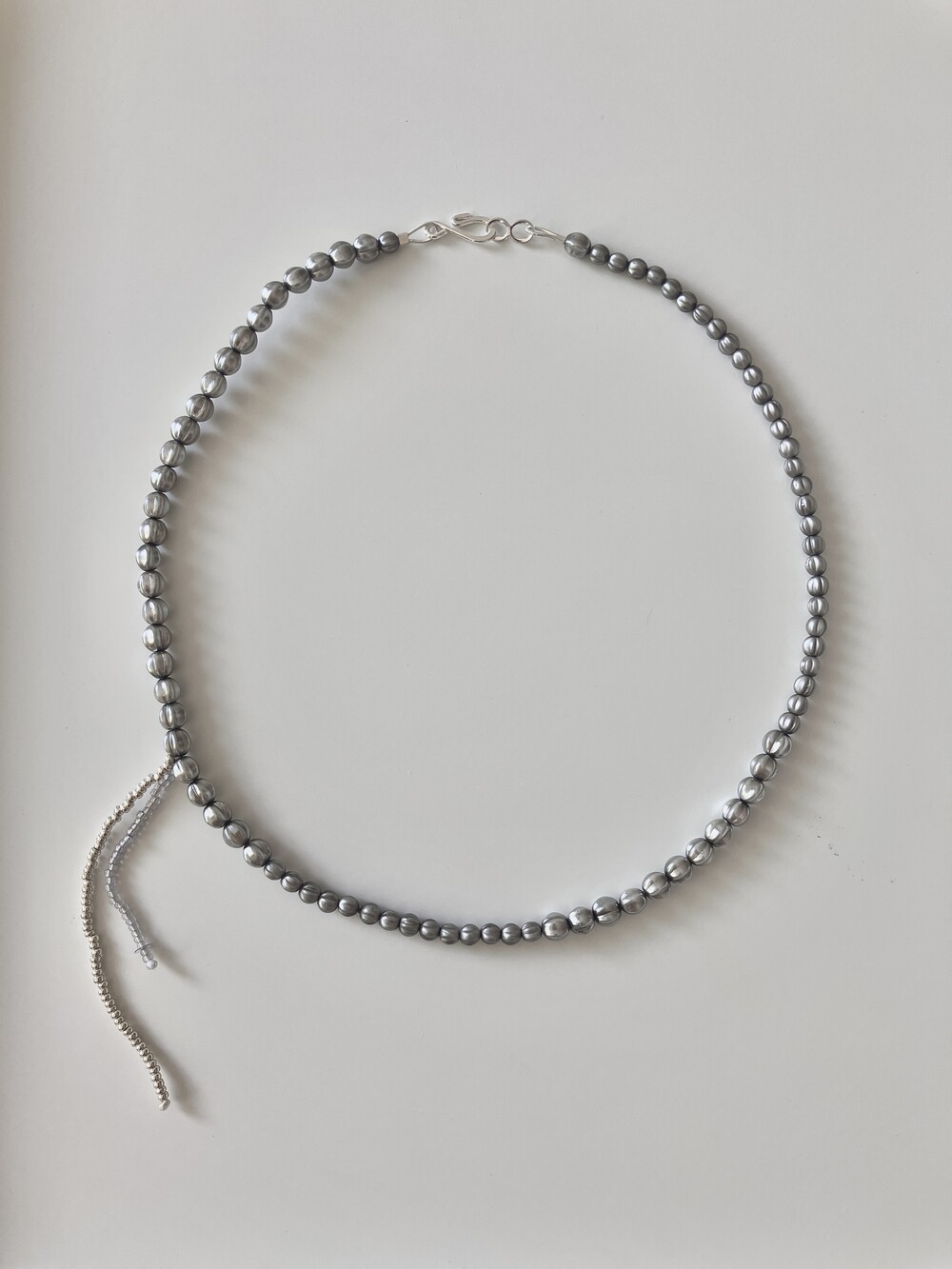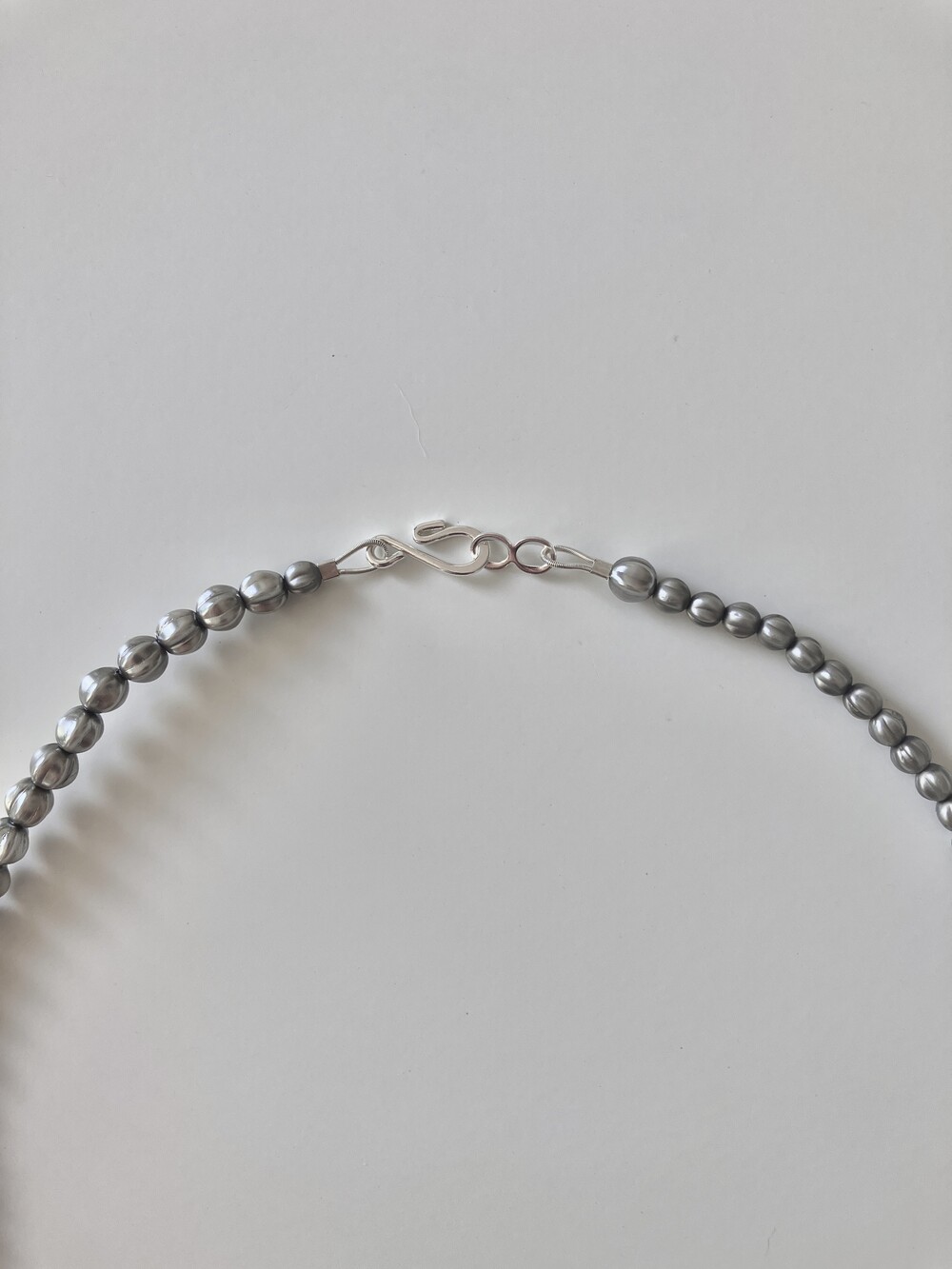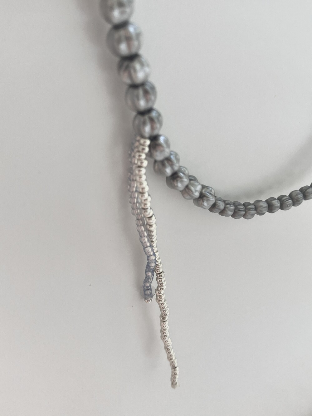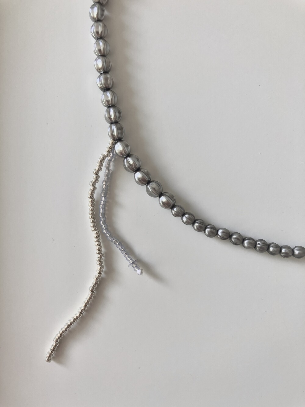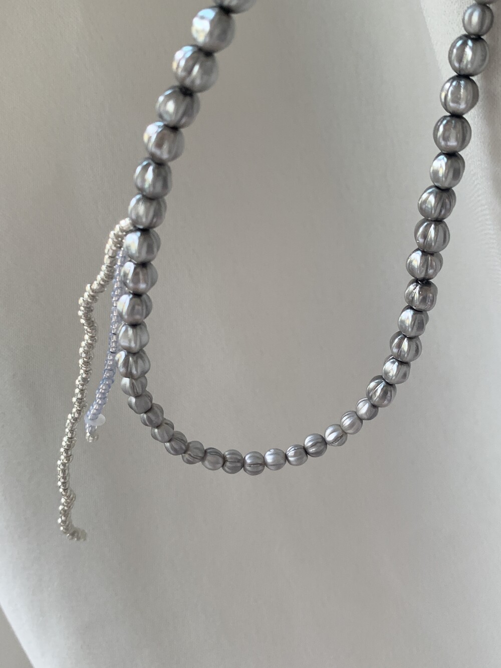 -mhp만의 시그니처 Point pearl의 Gray 컬러 버젼 -표면에 줄이 새겨져 있는 특별한 진주에, 유광,무광,크기별로 디테일하게 디자인 -gray 진주 베이스에 스팽글, 실버와 오팔그레이 컬러를 띈 서로 다르게 엮어진 비즈라인이 특별하고 은은한 포인트가 됨 *진주에 무늬를 입히는 공정과정에서 생기는 작은 홈, 스크레치는 불량이 아닙니다.