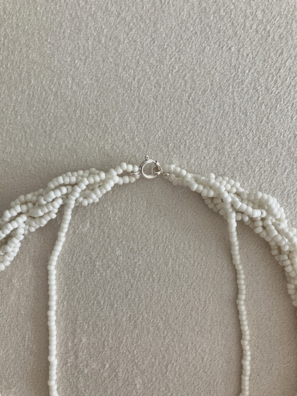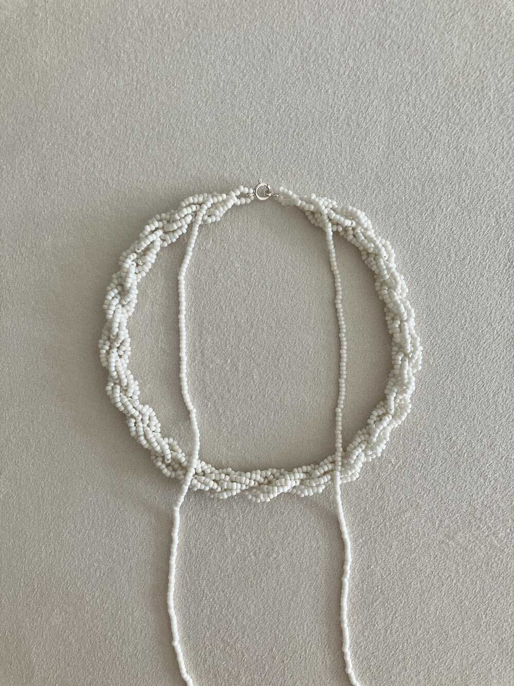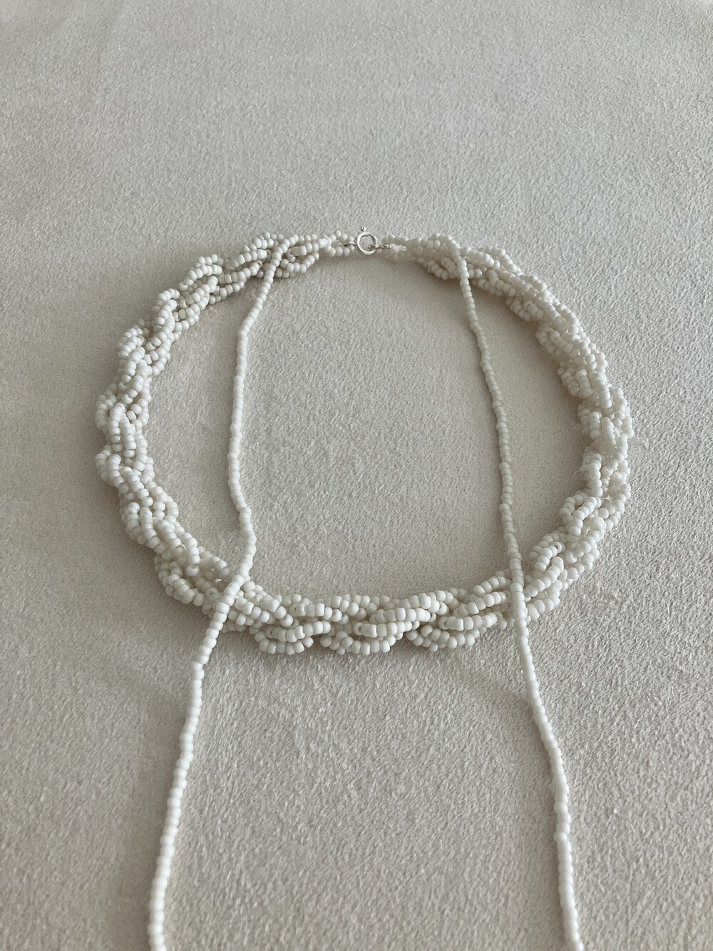 - 2023 S/S ¨Rope Aesthetics¨ - 밧줄의 꼬임에서 영감을 받은 이번 컬렉션은 한알 한알 비즈를 손으로 엮어 모양을 만들어 내는 전통적인 기법으로 제작되었습니다. - 한방울 그레이 빛을 머금은듯한 탁한 아이보리 컬러로 마치 바다의 모래를 한알 한알에 담아 낸듯한 Greyish ivory. - 로프 네크리스에 롱 한 길이감의 네크리스를 함께 엮어 원하는 무드로 다양한 연출이 가능 (탈부착 불가능) - Sterling Silver 클래습으로 마감 *비즈의 공정과정상 회색이나 검은색의 줄이나 점등이 희미하게 보일 수 있습니다.