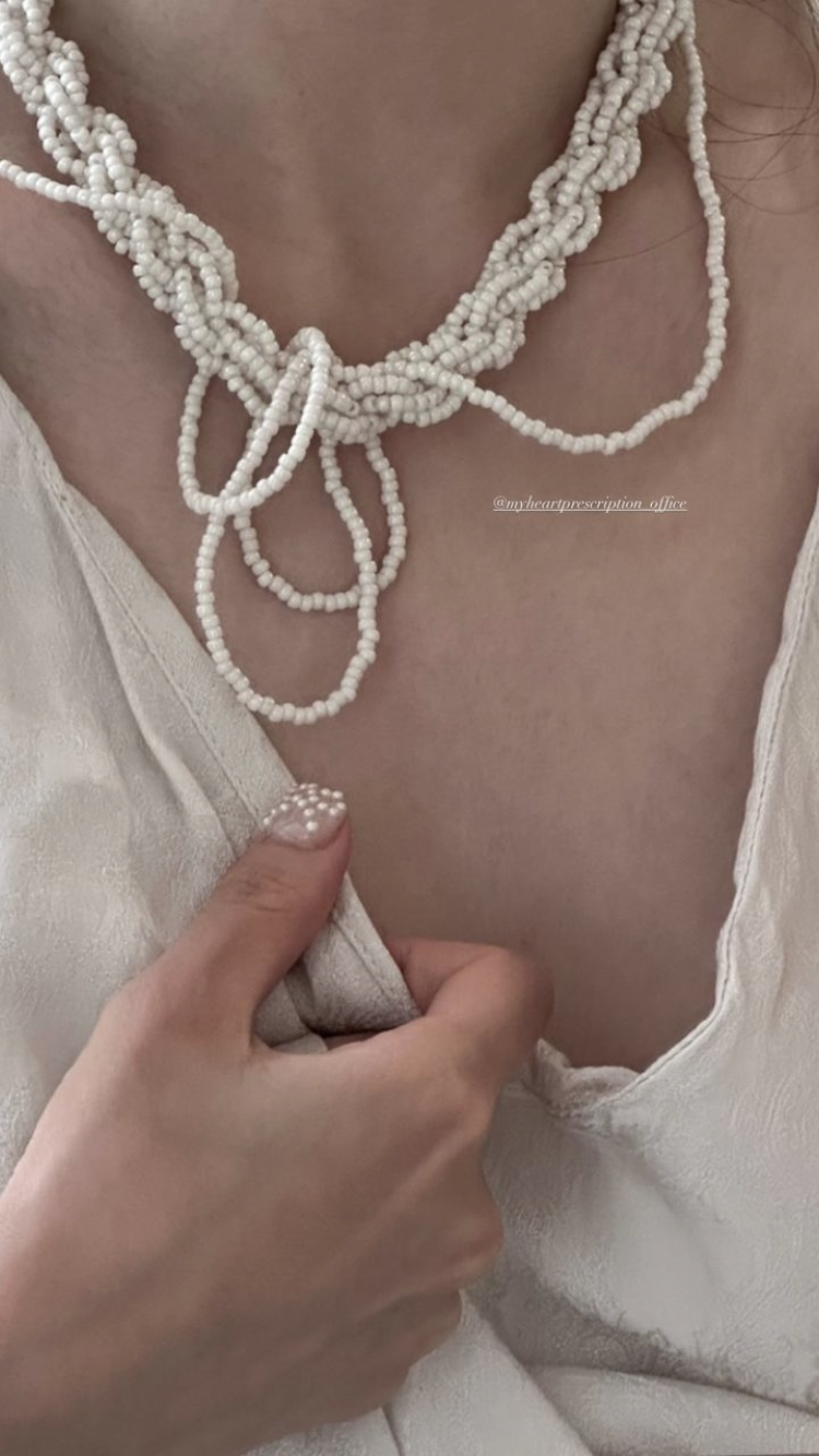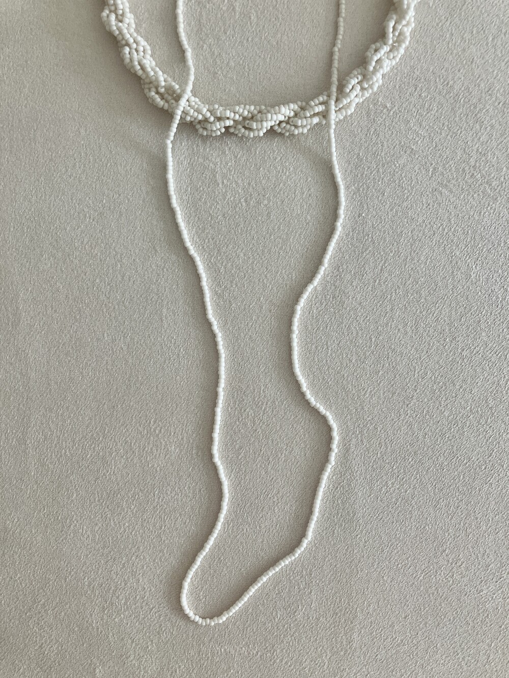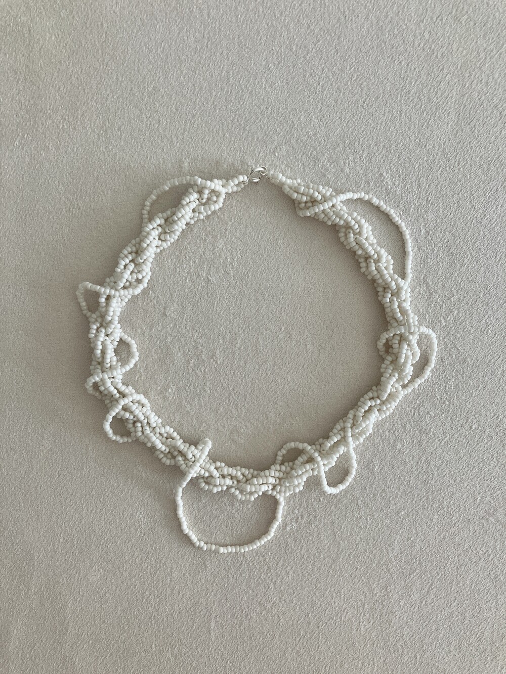 - 2023 S/S ¨Rope Aesthetics¨ - 밧줄의 꼬임에서 영감을 받은 이번 컬렉션은 한알 한알 비즈를 손으로 엮어 모양을 만들어 내는 전통적인 기법으로 제작되었습니다. - 한방울 그레이 빛을 머금은듯한 탁한 아이보리 컬러로 마치 바다의 모래를 한알 한알에 담아 낸듯한 Greyish ivory. - 로프 네크리스에 롱 한 길이감의 네크리스를 함께 엮어 원하는 무드로 다양한 연출이 가능 (탈부착 불가능) - Sterling Silver 클래습으로 마감 *비즈의 공정과정상 회색이나 검은색의 줄이나 점등이 희미하게 보일 수 있습니다.