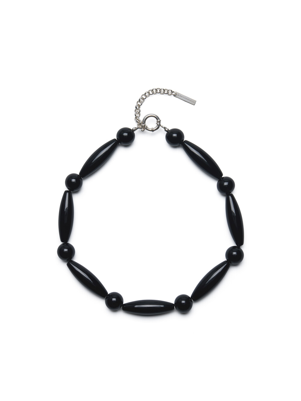 - 타원형과 원형의 오닉스 비즈가 리듬감 있게 연결된 구조적 디자인 - 유광 블랙이 빛을 받아 선명하게 반사되며 묵직한 인상줌 - 절제된 조형 안에 단단함과 감각을 담아냈으며, 룩에 모던하고 클래식한 무드를 줌 - 고급스러운 실버 헤드와 퀄리티가 우수한 이태리 체인디테일로 자유로운 길이 조절 가능 - my heart prescription 실버 마감 택