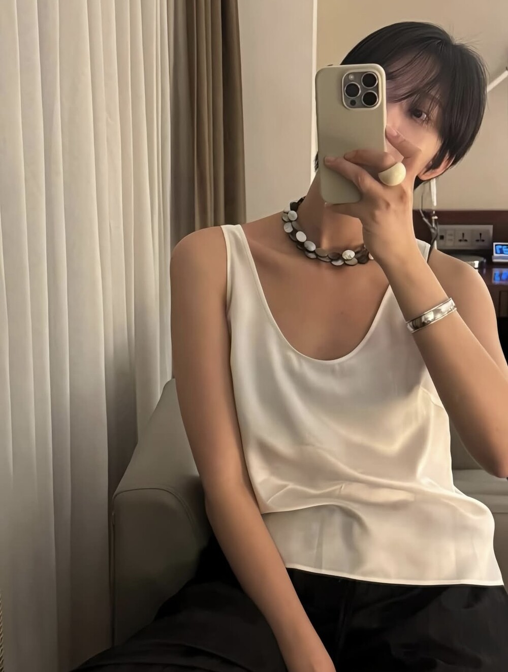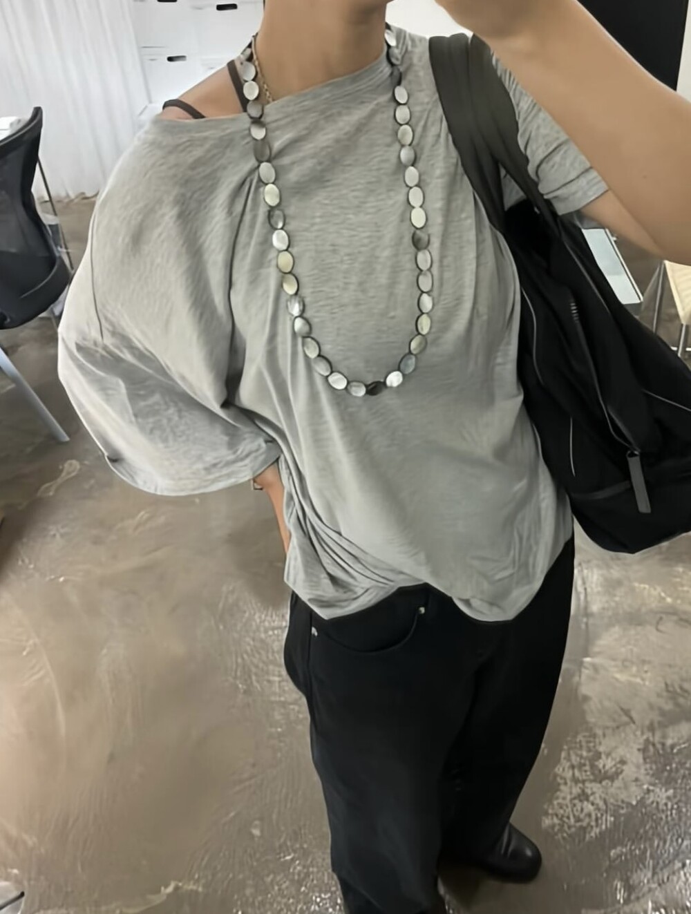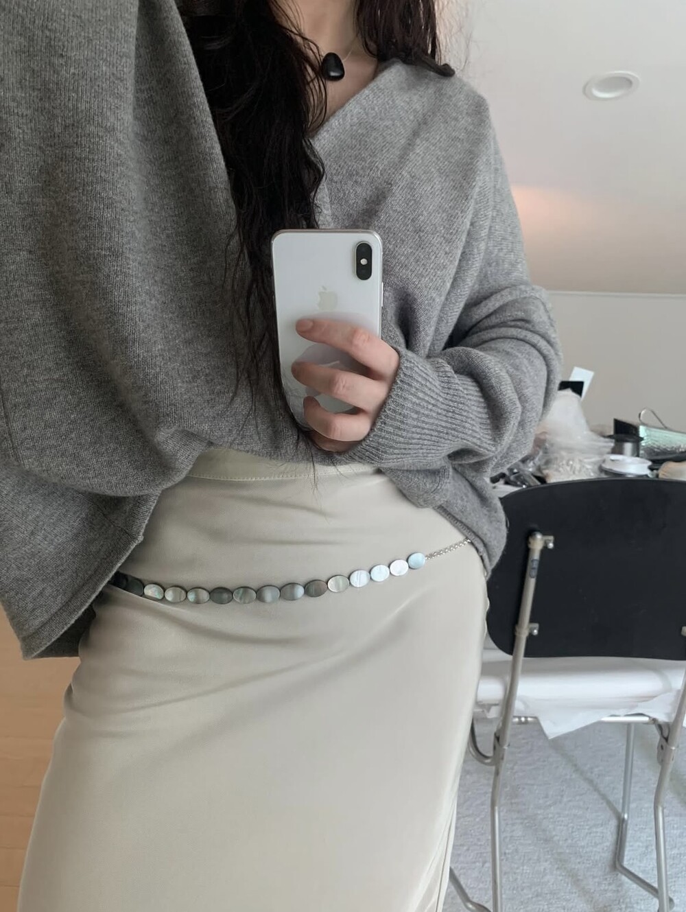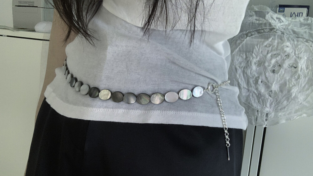 - 빛에 따라 달라지는 자개 특유의 미묘한 색감 - 블랙 자개 특유의 차분하며 세련된 반사광의 배열 - 네크리스와 벨트로 연출할 수 있는 컨버터블 아이템 - 클래식하면서도 볼드한 인상을 주며, 가벼운 무게로 심플한 룩에 멋스럽게 녹아드는 디자인 - 고급스러운 실버 헤드와 퀄리티가 우수한 이태리 체인디테일로 자유로운 길이 조절 가능 - my heart prescription 실버 마감 택 *천연 자개 소재로 표면에 울퉁불퉁함, 구멍 등이 보여질 수 있으며 이는 자연스러운 현상으로 불량/환불 사유가 되지 않습니다.