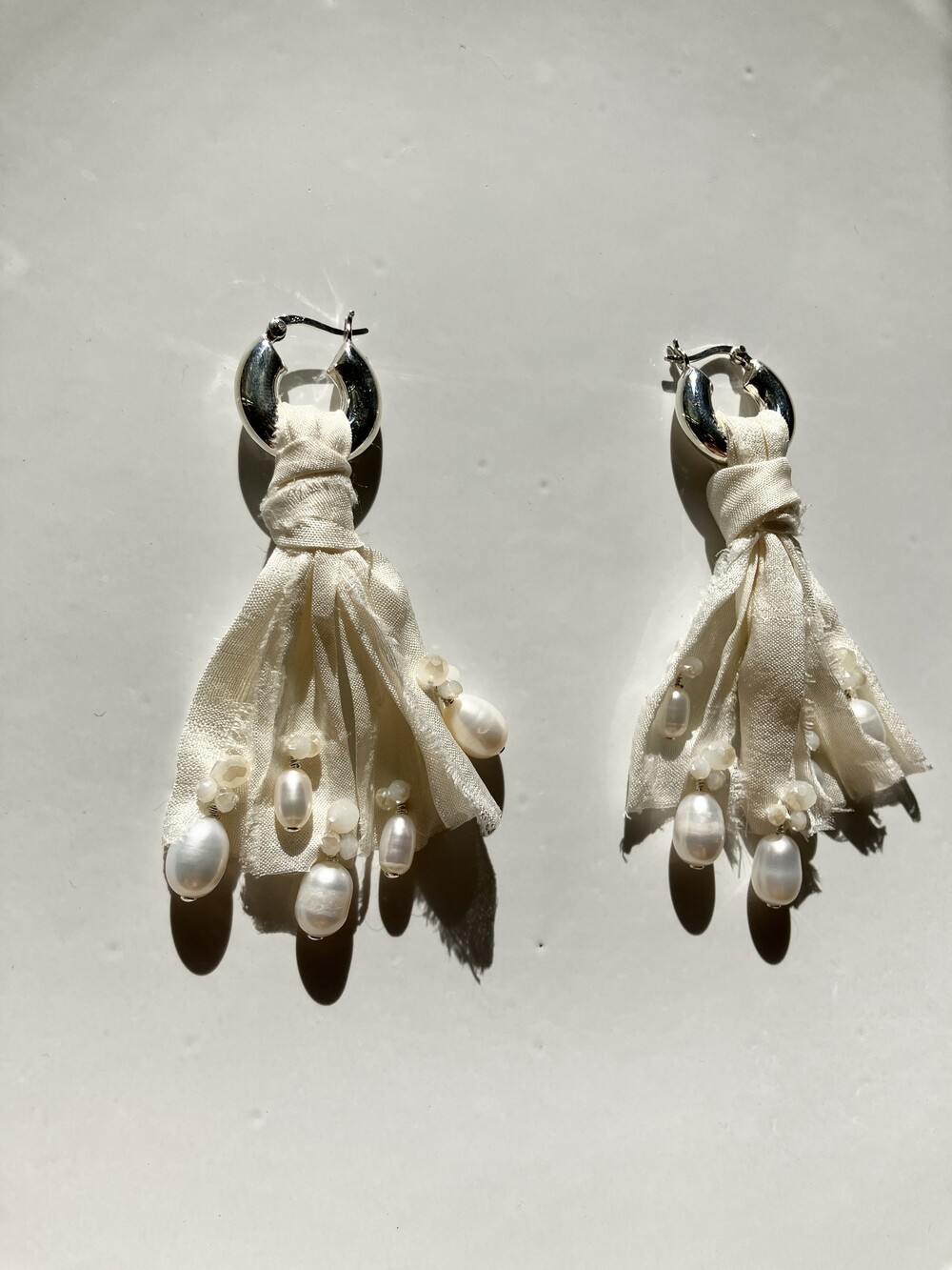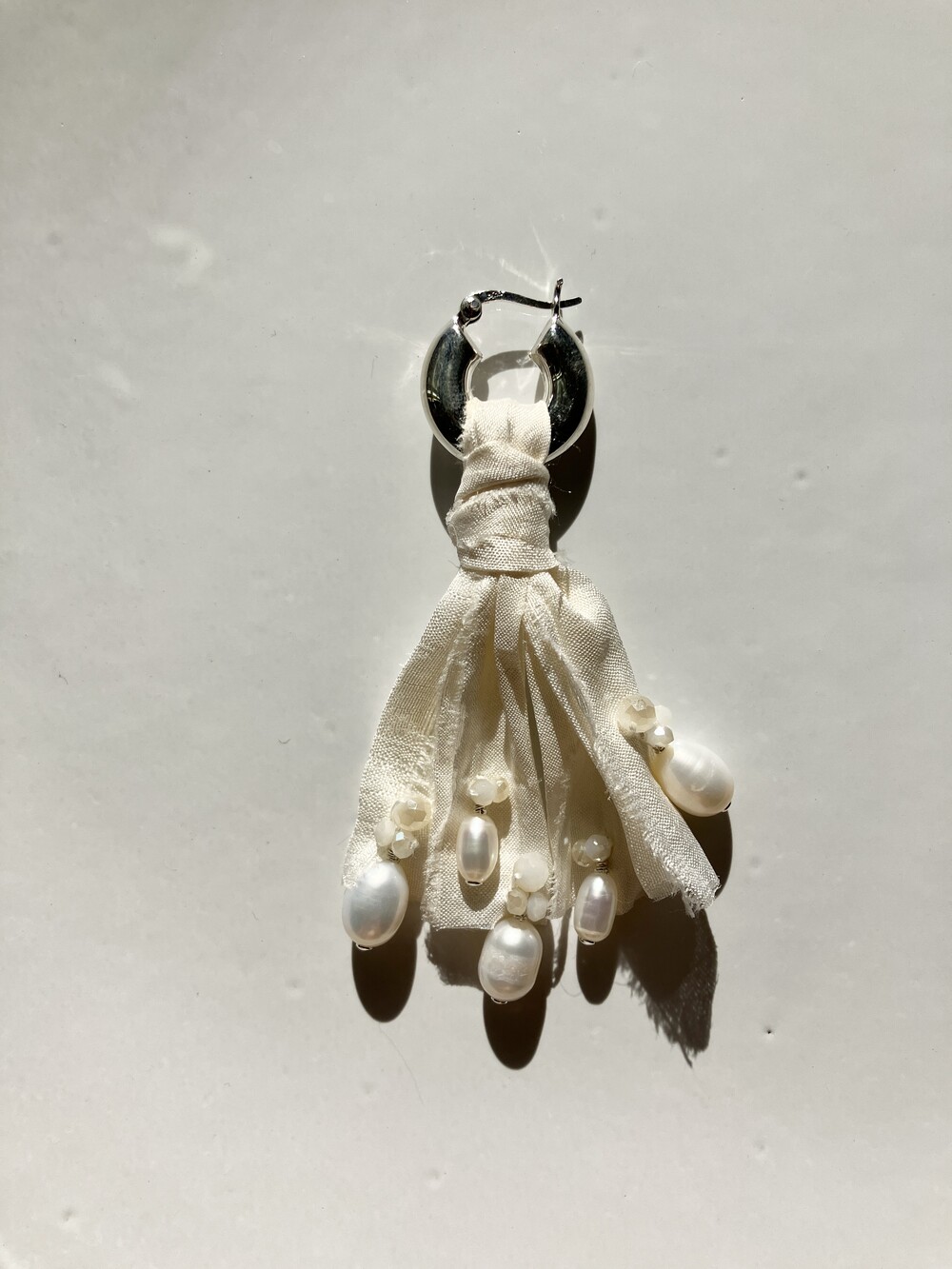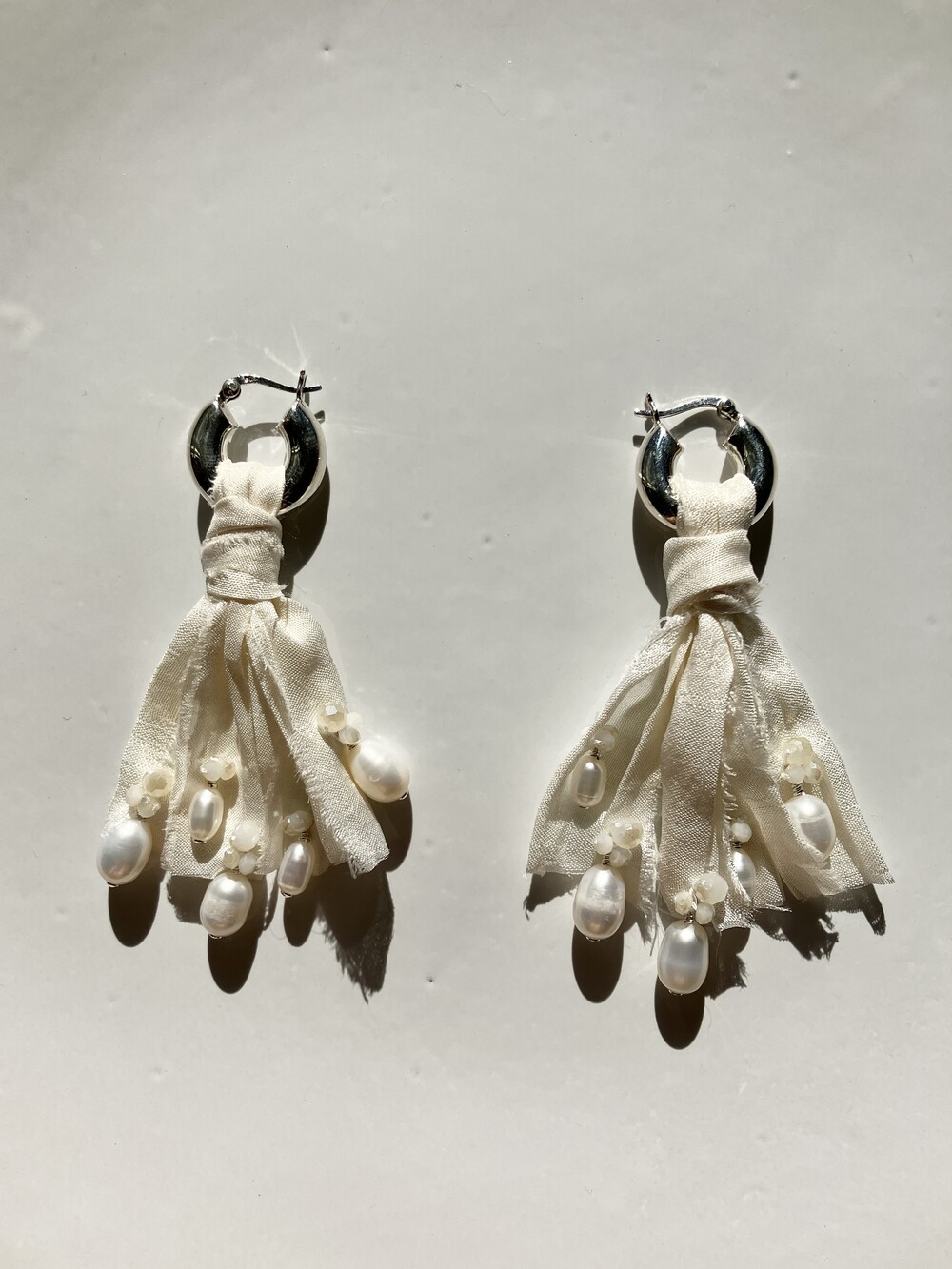 - 내츄럴한 주름이 잡힌 생지 실크 원단을 재단하여 다림질 및 풀림처리 후 Sterling Silver선으로 진주를 엮어 반짝이는 비즈를 수놓은 특별한 디자인. - Sterling Silver 소재의 볼드하지만 가벼운 후프 이어링 - 담수 진주로 우아하고 아름다운 발색