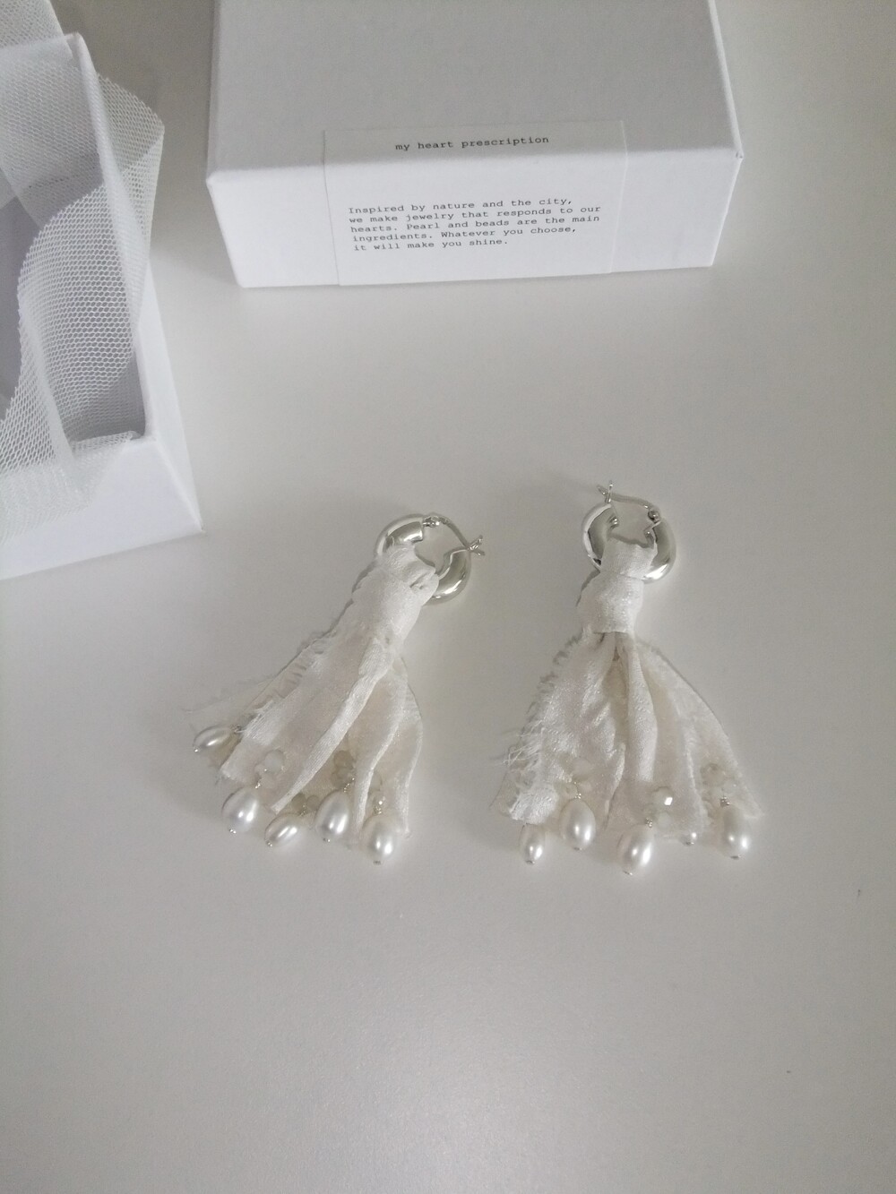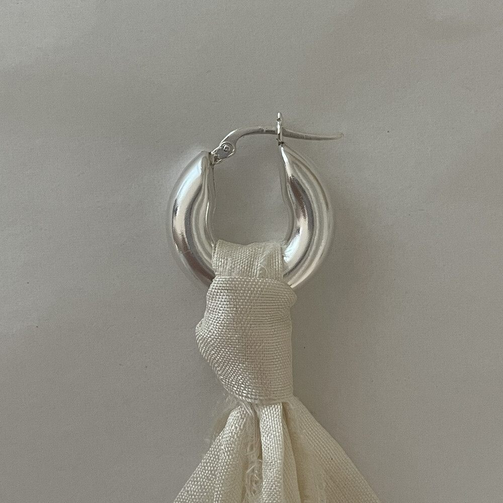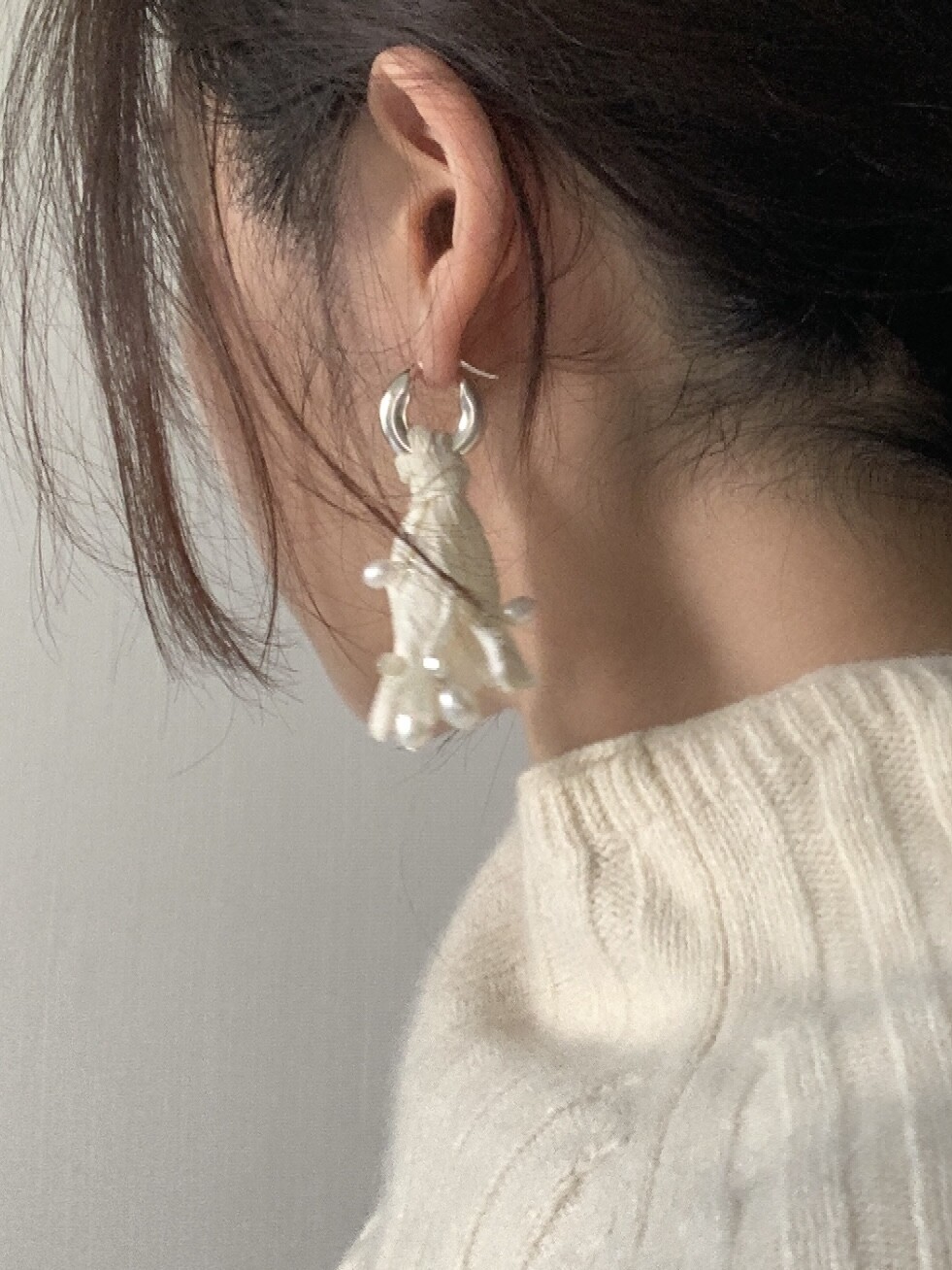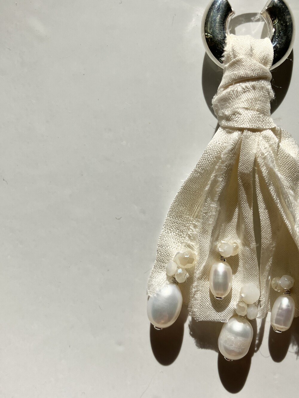 - 내츄럴한 주름이 잡힌 생지 실크 원단을 재단하여 다림질 및 풀림처리 후 Sterling Silver선으로 진주를 엮어 반짝이는 비즈를 수놓은 특별한 디자인. - Sterling Silver 소재의 볼드하지만 가벼운 후프 이어링 - 담수 진주로 우아하고 아름다운 발색