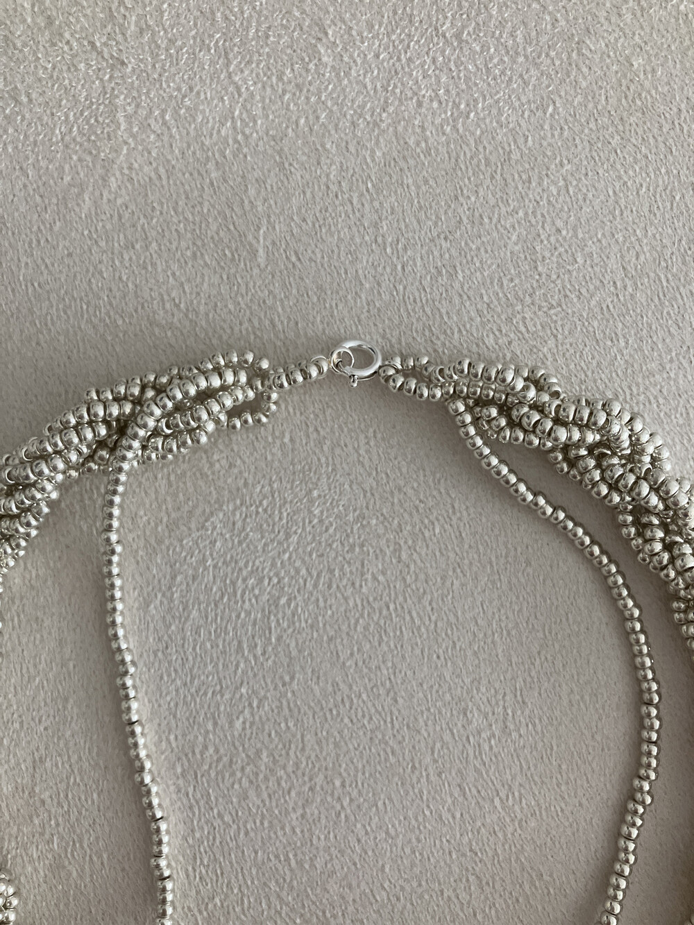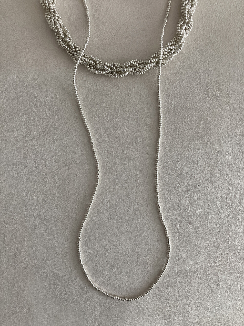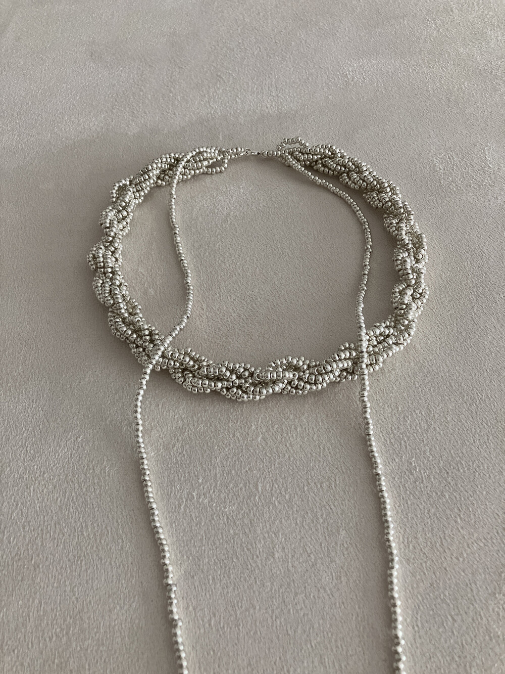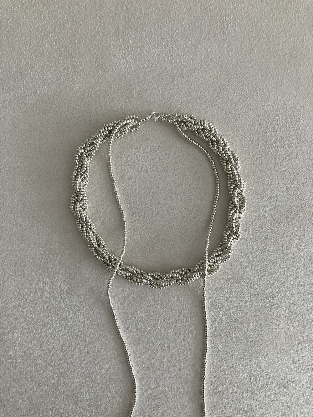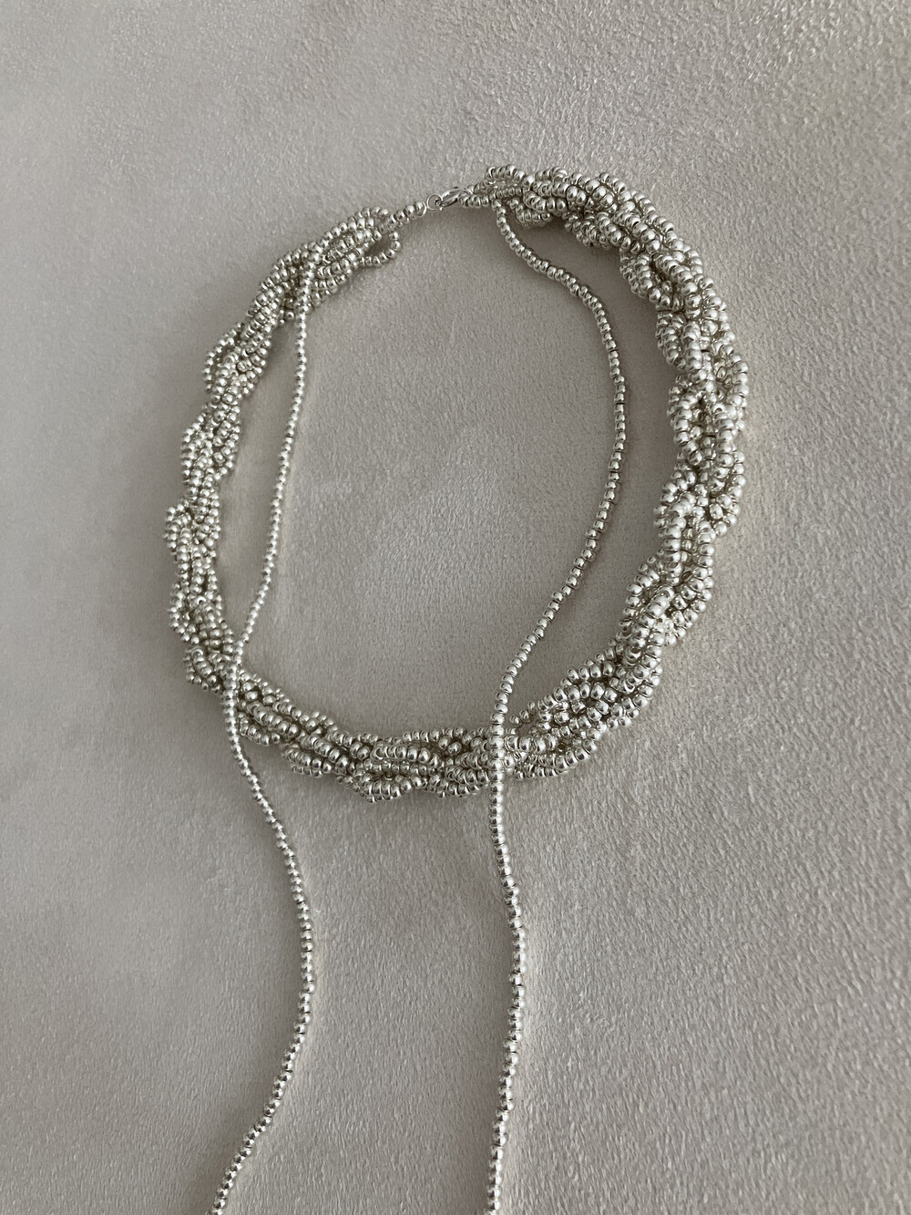- 2023 S/S ¨Rope Aesthetics¨ - 밧줄의 꼬임에서 영감을 받은 이번 컬렉션은 한알 한알 비즈를 손으로 엮어 모양을 만들어 내는 전통적인 기법으로 제작되었습니다. - 매일을 위한 아름다운 Silver color - 로프 네크리스에 롱 한 길이감의 네크리스를 함께 엮어 원하는 무드로 다양한 연출이 가능 (탈부착 불가능) - Sterling Silver 클래습으로 마감 *메탈컬러를 입힌 비즈 특성상 사용감에 따라 컬러가 조금씩 빠질 수 있습니다. 이 부분은 자연스러운 현상으로 교환 및 반품, 환불 사유가 되지 않습니다.