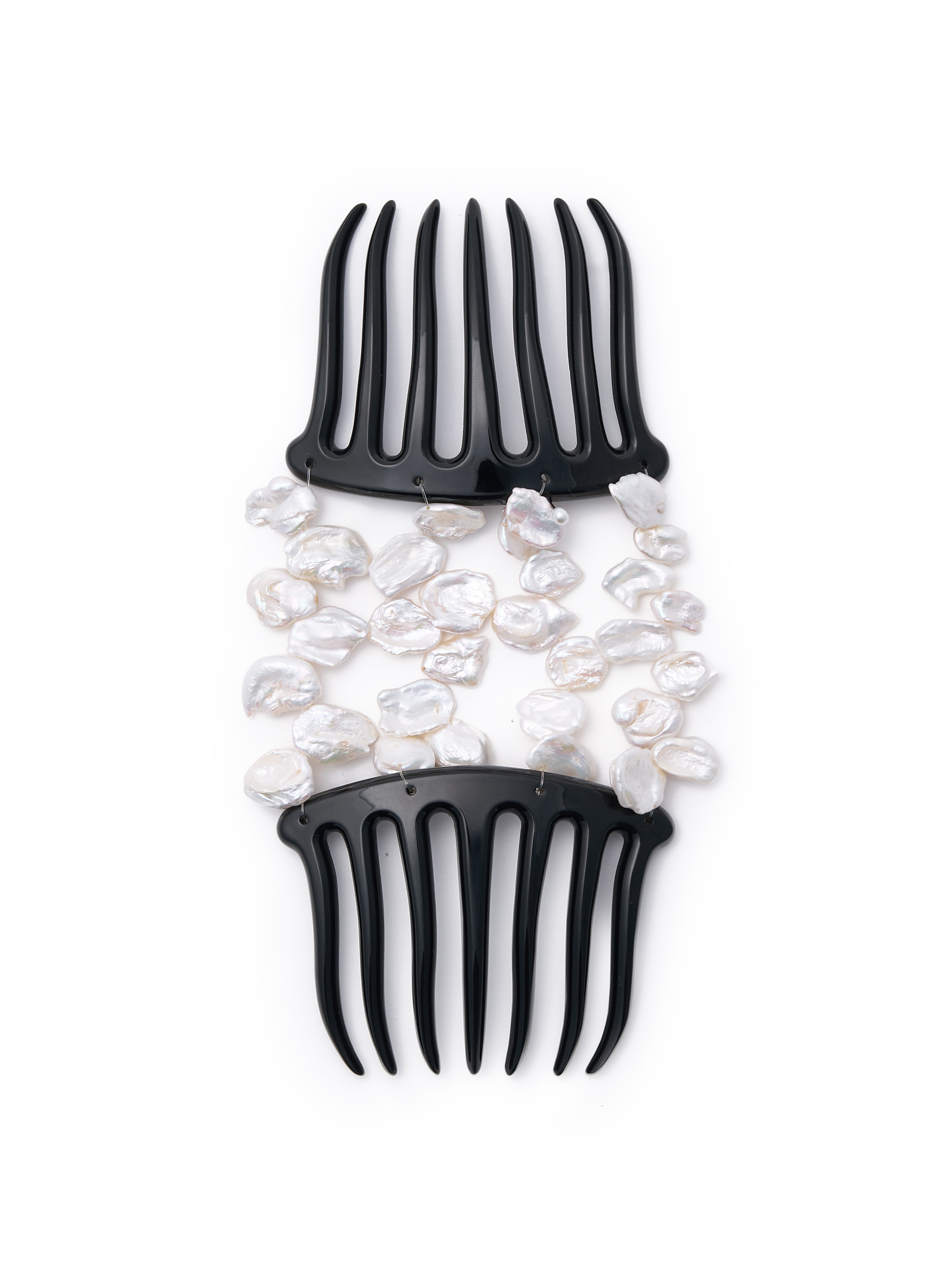 Adorn Magic Double Comb - No.3 는 엄선된 고급 바로크 담수진주를 사용해 제작되었습니다. 각 진주는 자연스러운 광택과 깊이 있는 빛을 지닌 개체만을 선별해 사용했습니다.